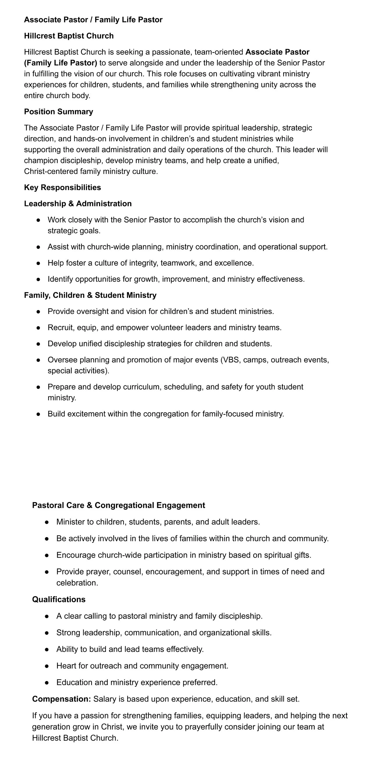 Associate Pastor / Family Life Pastor